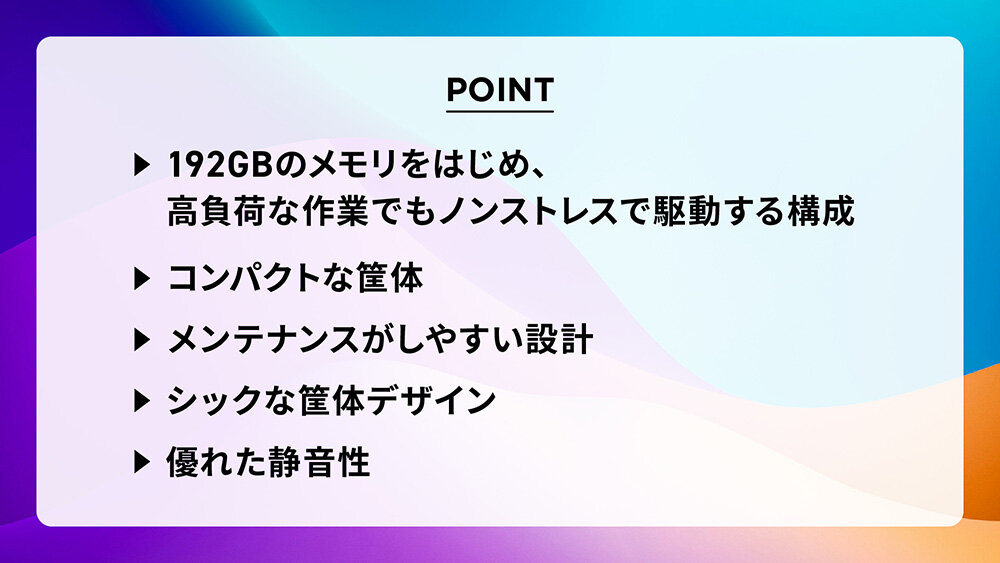 プロのクリエイターにとって、PCのダウンタイムは致命的だ。トラブルシューティングに時間を割くよりも、制作に没頭したい。そのためには、サポート体制が万全で、ハードウェアの信頼性が担保されたワークステーションを選ぶことが、結果として最もコストパフォーマンスの高い投資になると藤田氏は語る。