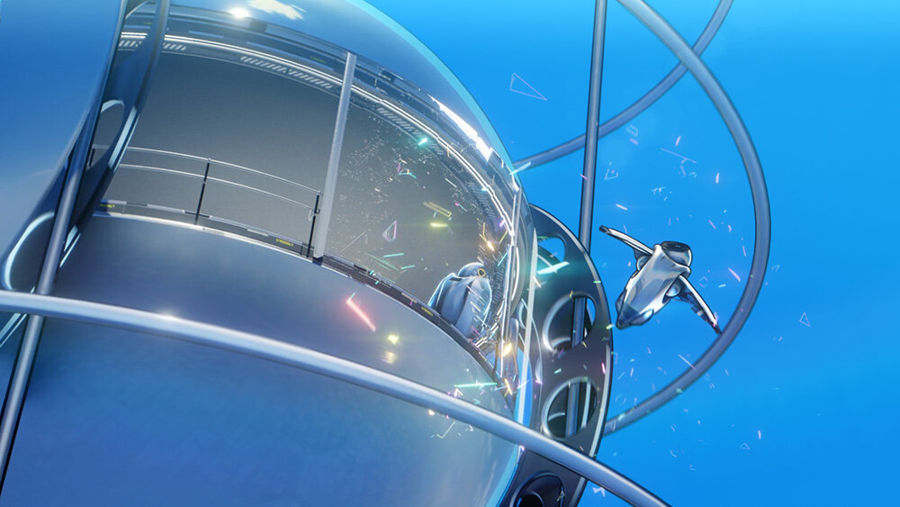 「ガラスの中に電子回路が埋め込まれている表現は、シェーダーノードでつくりました。回路の特定の部分だけを抽出して発光させたり、透明度を調整することで、『透明だけど中に何かが詰まっている』という不気味な質感を表現したんです。自分の好きなSFのビジュアルと、技術的な実験を全て詰め込んだ、思い入れのあるカットです」(藤田氏)。