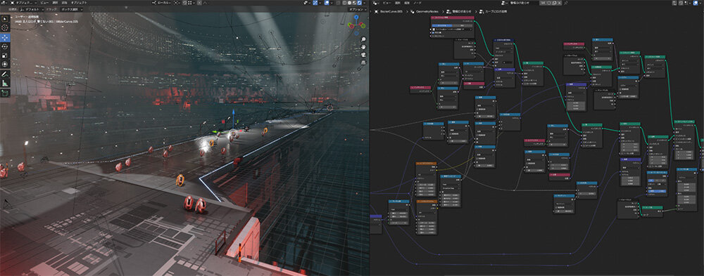 「カーブに沿ってロボットが走る仕組みを、全てジオメトリノードで組んだんです。カーブを曲がる時にボディが傾くような処理も数式で制御しています。シミュレーションノードを使うとキャッシュのベイクが必要になり、途中からの再生が難しくなったりデータが重くなったりするんですが、この手法ならタイムラインのどこから再生しても破綻しません。修正も簡単で、結果的に大幅な工数削減になりました」(藤田氏)。