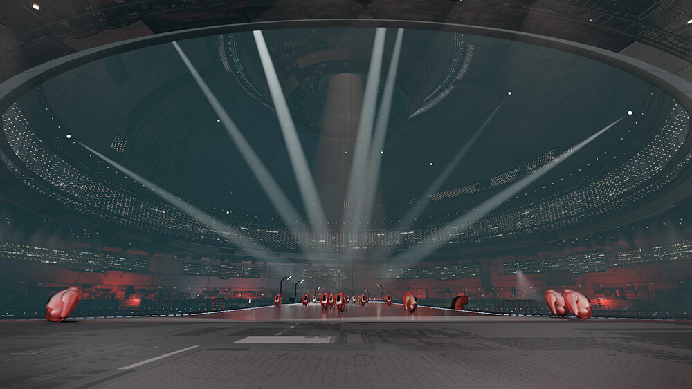 また、膨大な数のロボットが回廊を疾走するシーンでは、ジオメトリノードがフル活用されている。通常、群衆シミュレーションには物理演算を用いることが多いが、藤田氏はあえてシミュレーションを使わなかった。