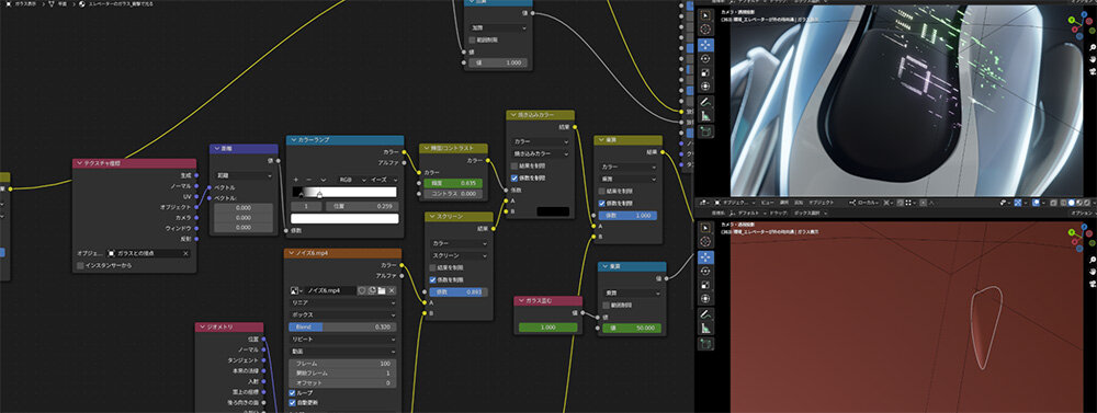 藤田氏の作家性は、その技術的なアプローチにも色濃く反映されている。Blenderのジオメトリノードやシェーダーノードを駆使したプロシージャルな表現は彼の真骨頂。作中の印象的なカットに、ロボットがガラスを突き破って落下していくシーンがある。このガラス内部に埋め込まれた電子回路の表現に、藤田氏の技術的こだわりが詰まっている。