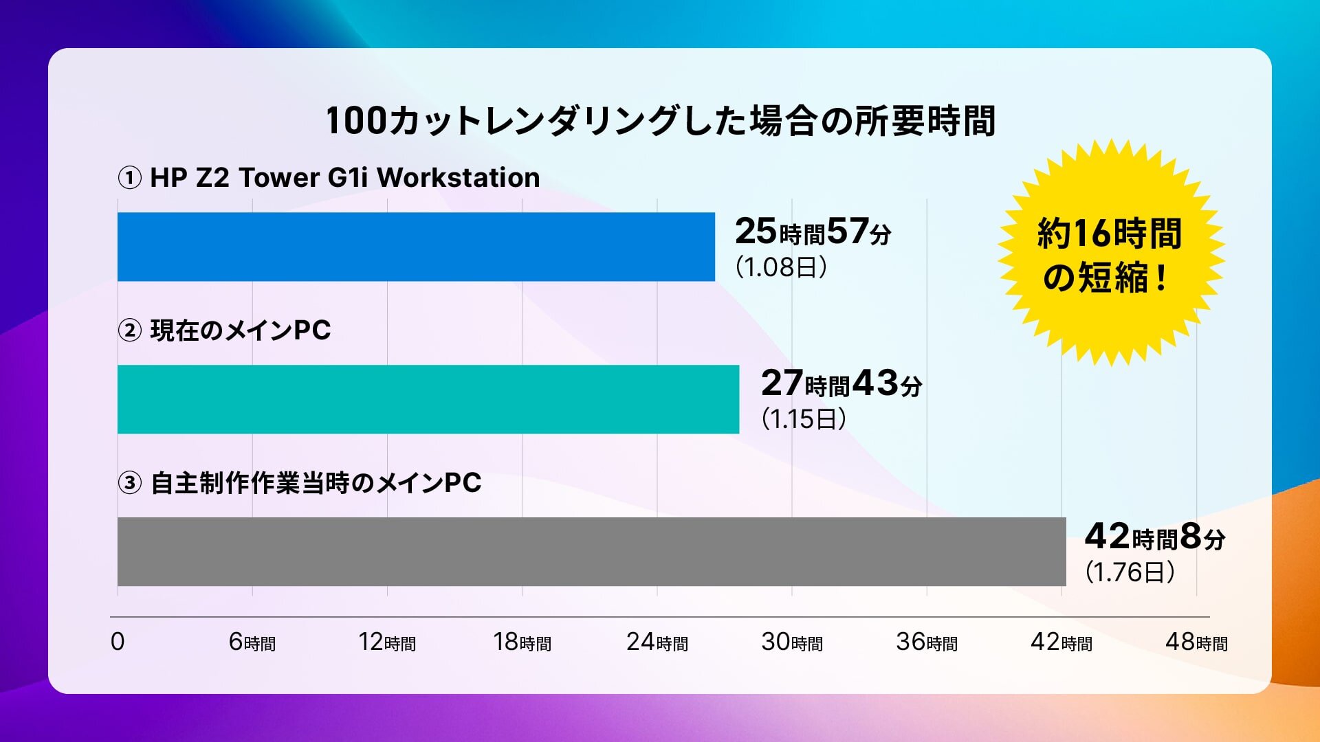 結果は歴然としていた。③制作当時のPCが1カットのレンダリングに25分17秒を要していたのに対し、②現在のメインPC(RTX 5080)は16分38秒。そして検証機である①HP Z2 Tower G1i Workstation(RTX 5090)は15分34秒を記録した。