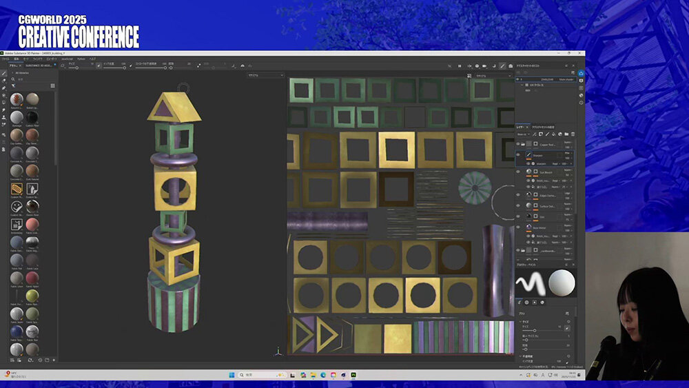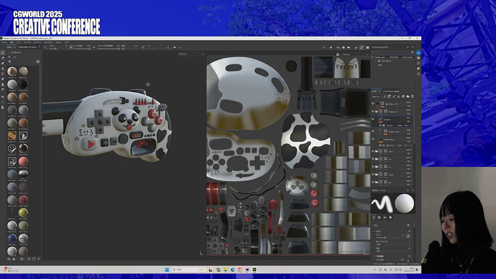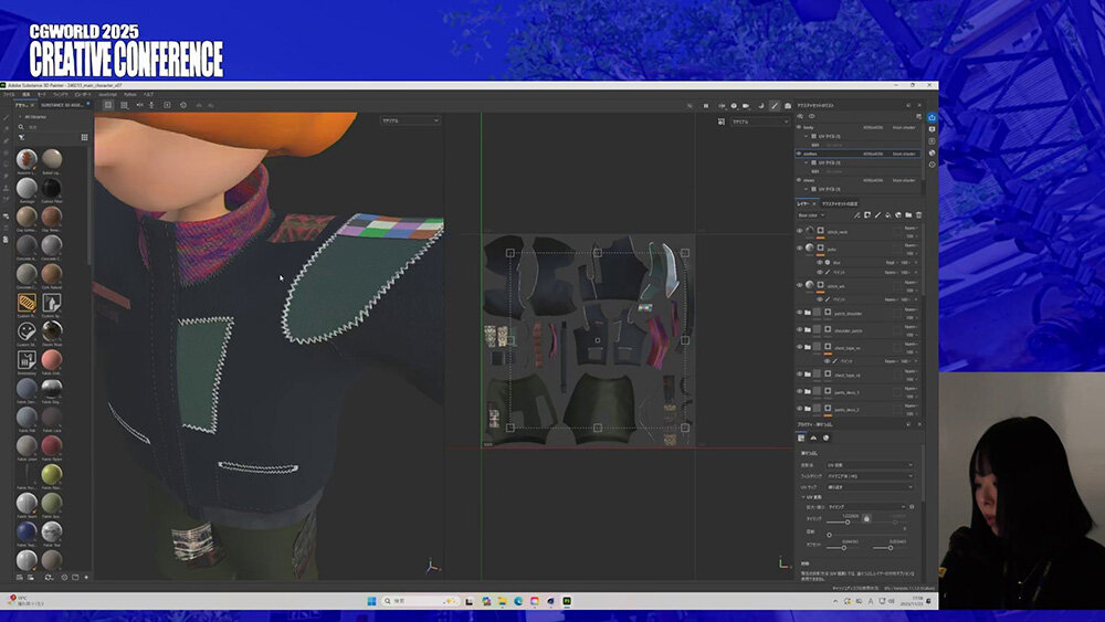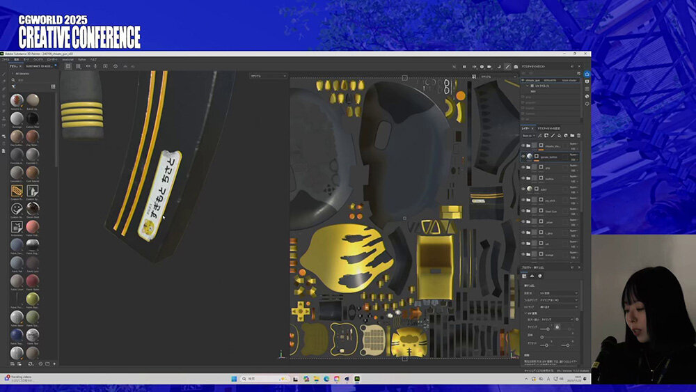 KANA氏はSubstance 3D Painterでの作業画面を披露。「スマートマテリアルも使っていますが、ステッチなどは手描きで入れています。『現実では、縫い目の下って少し盛り上がるよね』といったディテールを手で描き込むことで、リアリティと温かみを出しました」と解説する。