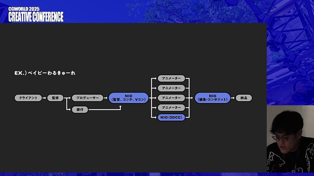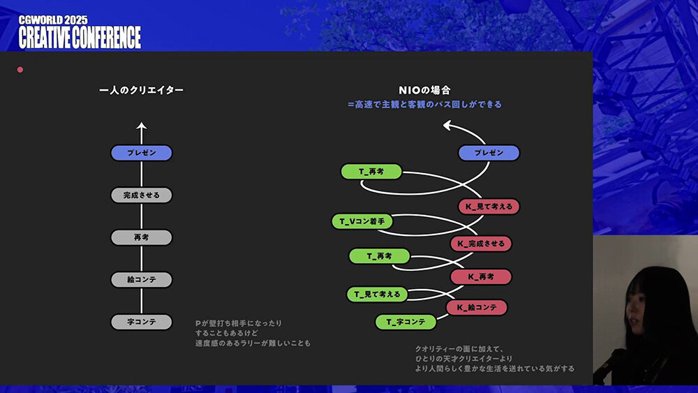 次に具体的な作品を例に挙げ、NIO流のビジュアル制作ワークフローが紹介された。彼らが最も重視しているのは「初動」だ。