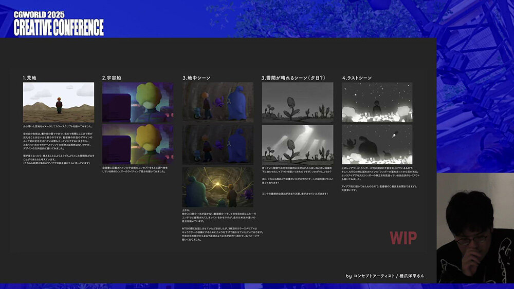 「3DCGは実写とちがって、言葉や字コンテだけでは共通のイメージをもちにくいものです。空の色ひとつとっても全員ちがうものを想像してしまう。だからこそ、私たちは企画書の段階で具体的な“画”を入れることに全力を注ぎます」(TAKUTO氏)。