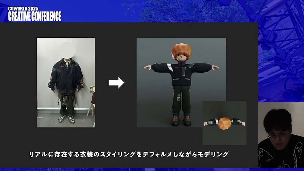 キャラクターデザインについては、実写のスタイリストと協業。3Dキャラクターの衣装を、実写のMVや広告で活躍するスタイリストに実際にスタイリングしてもらい、その写真をベースにモデリングを行っている。「リアルな服のシワや縫い目、素材感を参考にしつつ、3Dにする上で不具合が出るひもなどは省略し、デフォルメしながらモデリングしました」(TAKUTO氏)。