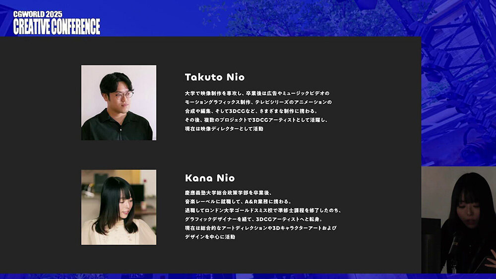 本セッションの冒頭、登壇したKANA NIO氏(以下、KANA氏)とTAKUTO NIO氏(以下、TAKUTO氏)は、まず「NIO」というユニットが形成された経緯と、そのユニークな制作体制について語った。