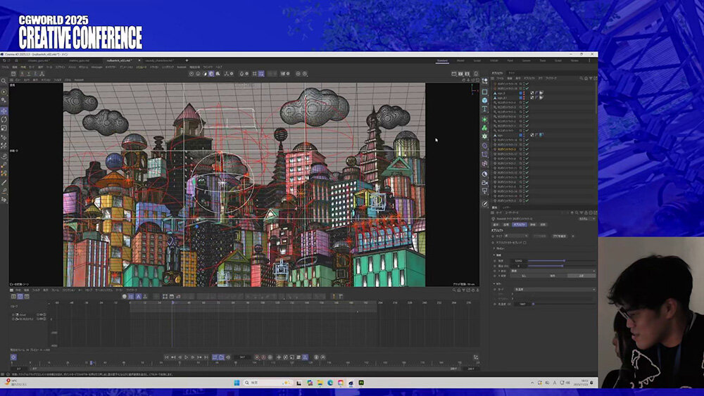 KANA氏が制作した大量のビルやオブジェクトの素材を、TAKUTO氏がCinema 4D上で組み上げ、配置していく。