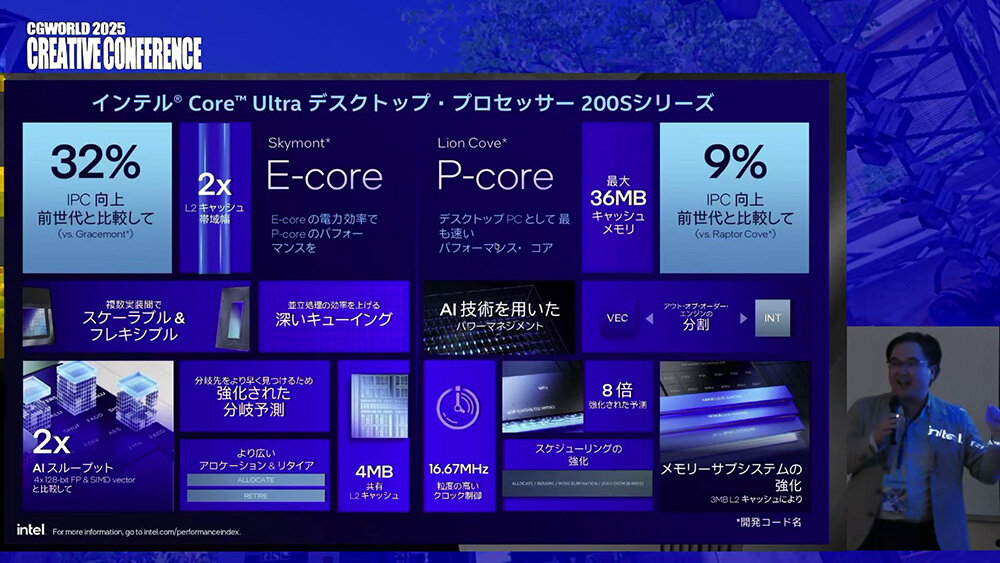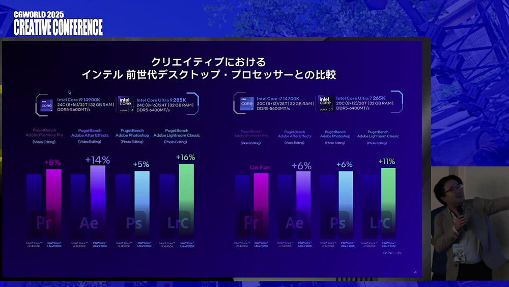 本機に搭載されているのは、インテルの最新CPU「インテル® Core™ Ultra 9 プロセッサー 285K」。矢内氏はその特徴を「強力なPコア(Performance-core)と、省電力なEコア(Efficient-core)のハイブリッド構造」と説明する。「今回のEコアは、前世代よりも高速で省電力。重たいレンダリング処理とバックグラウンド処理を効率よく分担し、クリエイティブワークを止めません」(矢内氏)。