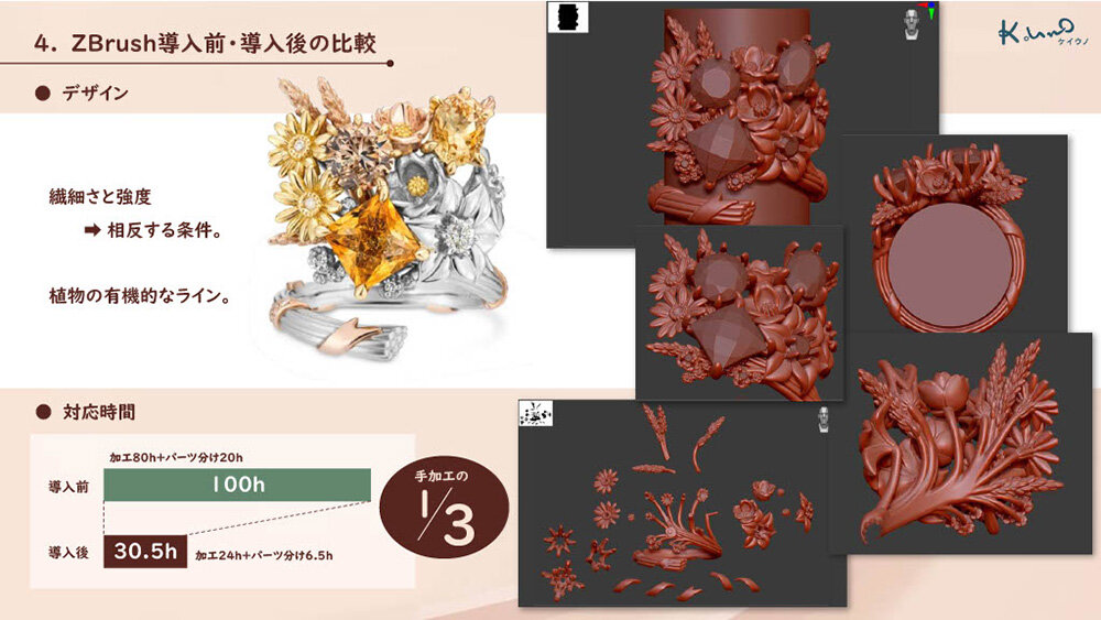 こちらは複数種類の金属を組み合わせてつくる「コンビ」の指輪で、全部で20パーツに分けてつくられています。これも手加工だと気の遠くなるような作業で、加工に80時間、パーツ分けに20時間、合わせて100時間は掛かると推定されますが、ZBrushと3Dプリンター活用することで、従来の3分の1の時間で製作することができています。