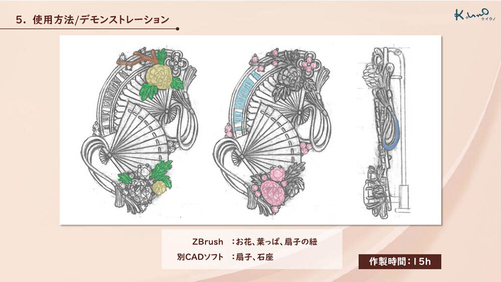 今回のデザインでは、扇子と石座の部分をCADソフトで、お花と葉っぱと扇子の紐の部分をZBrushで作成することにしました。