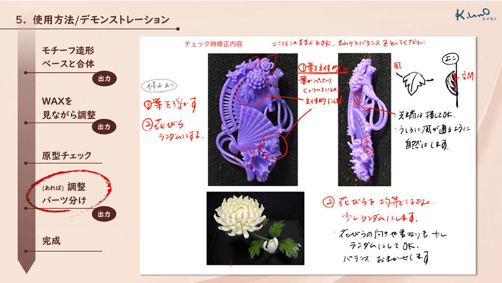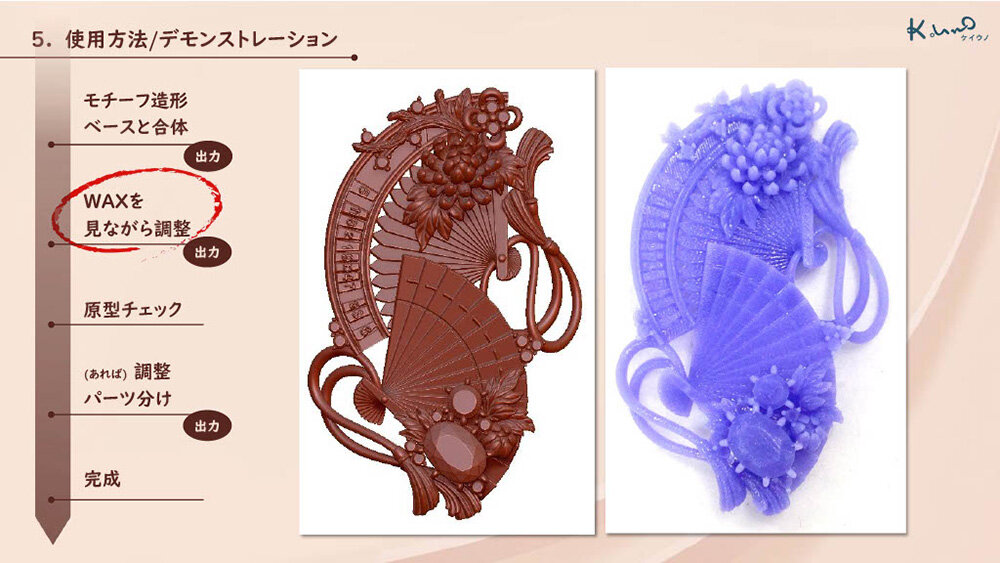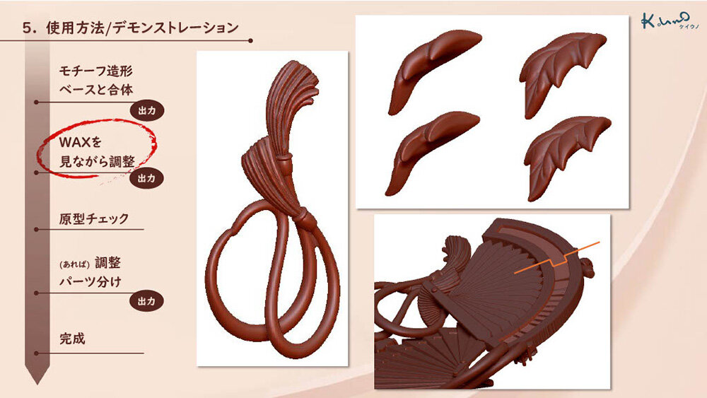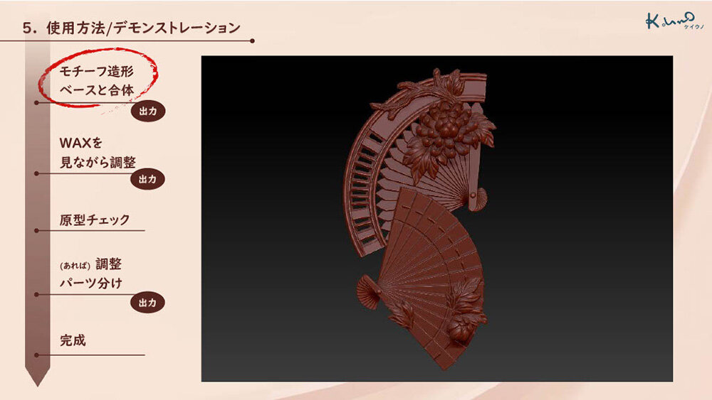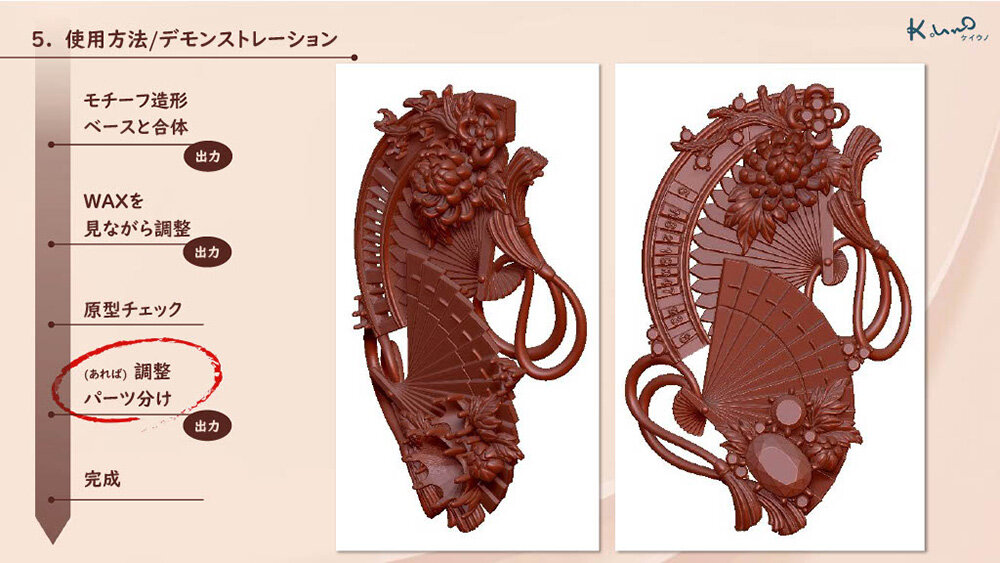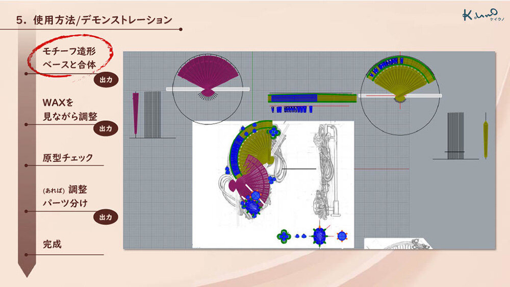 耕田:現在、加工を担当している職人は150人くらいですね。店頭でお客様からご要望がありましたら、デザイナーさんがデザインをその場で描いて、そのデザインが製造の方に回ってきて、我々が加工していくというながれになっています。原型加工の過程に関しましては、手作業で加工したものと、ZBrushやCADソフトを用いたものの両方があります。