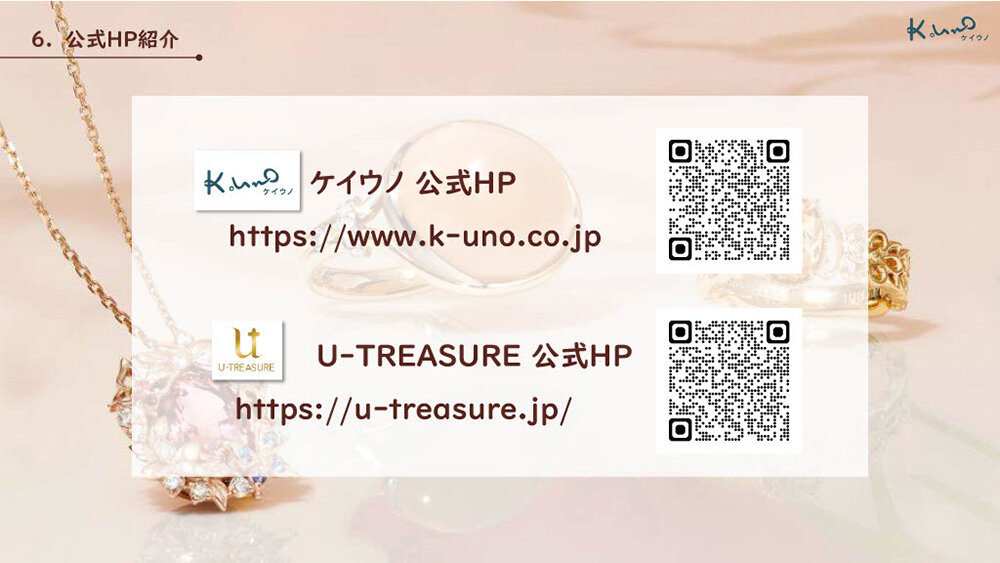 耕田さとみ氏(以下、耕田):ケイウノは1981年に創業し、「お客様に特別な感動と喜びを贈り続ける」というコンセプトのもとに、デザイン・製作・販売の一貫体制を取っています。日本全国に30店舗以上を展開しているほか、台湾にも3店舗を構えています。お客様ひとりひとりの細やかな要望に対応しており、年間に生み出すデザインは4万種類にもなります。また、キャラクターモチーフのジュエリー・時計なども手掛けています。