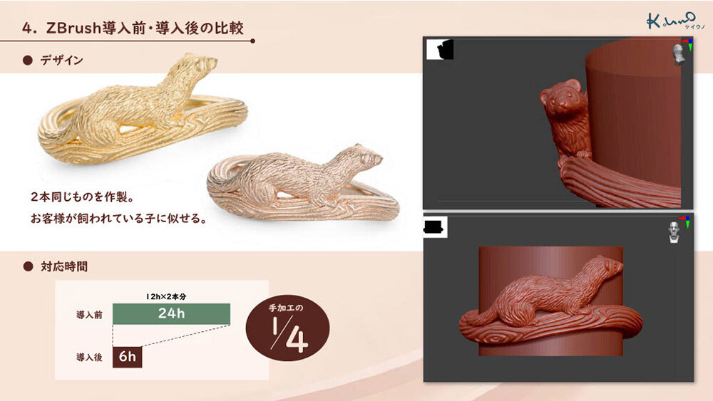 こちらはお客様から全く同じ指輪がふたつ欲しいとオーダーいただいたのですが、従来の手作業によるワックス原型ですと、全く同じものをイチからふたつつくる必要がありました。そうなると1点につき12時間、2つで24時間かかることになるんですが、ZBrush導入後はモデルをひとつだけつくればいいので、6時間、つまりトータル4分の1の時間で製作できたことになります。