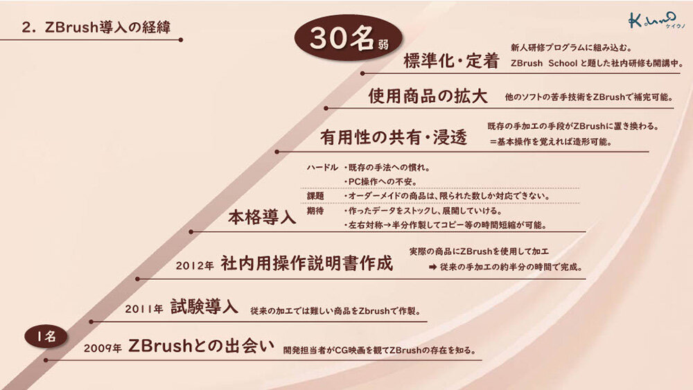 ZBrushの導入が軌道にのったことで、標準化してみんなが使用できるようにしたいと考えるようになり、新人研修にZBrushの基礎的な使用方法を入れたり、ZBrushスクールと題して社内研修も行ってみたりしました。