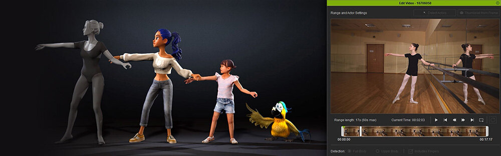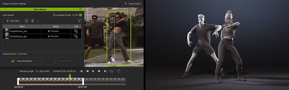エネルギッシュな振り付けから親密な会話に至るまで、iClone Video Mocapはあらゆるキャプチャに精密な制御をもたらす。クリップを視覚的にトリムし、必要なパフォーマンスに合わせて検出範囲を定義する。アクターが複数のフッテージでは、各パフォーマーごとにタスクを複製して検出を分離するだけで、キャラクターひとりひとりの動きをクリーンかつ正確に保てる。