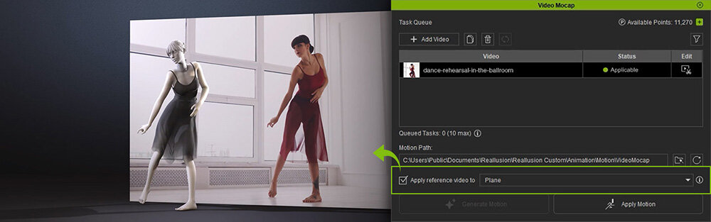 モーションが生成されると、参照用動画が自動的にビューポートに2D背景として読み込まれ、アニメーションを元のフッテージとリアルタイムに比較できる。