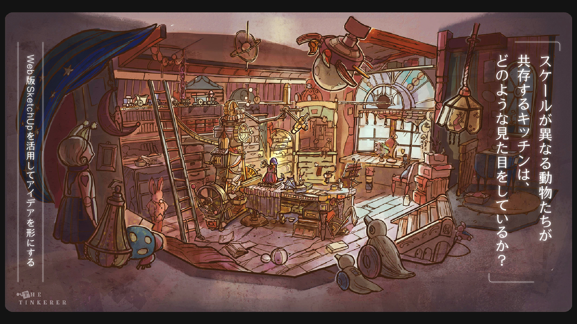 スケールが異なる動物たちが共存するキッチンは、どのような見た目をしているか?